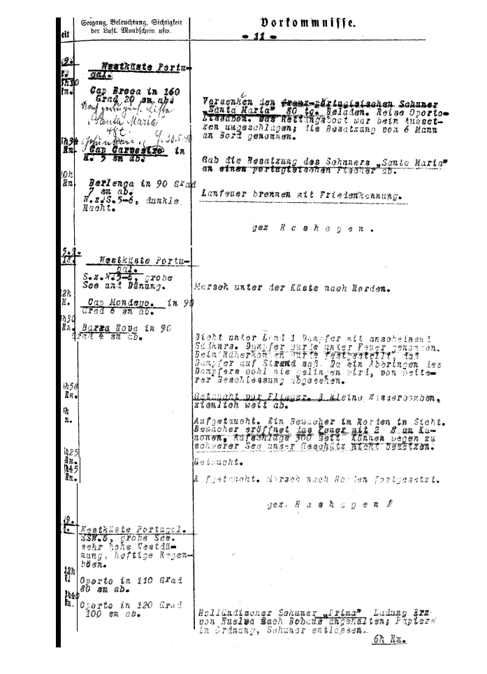 Em função deste documento, confirma-se que o submarino em questão foi o U-22, sob o comando do capitão Hinrich Hermann Hashagen, durante uma patrulha a navegar ao longo da costa, de sul para norte, no dia 4 de Setembro de 1918. Durante a manhã o submarino atacou e afundou o barco de pesca “Santa Maria”, quando este se encontrava ao largo de Peniche. Continuando a viagem para norte, já durante a tarde, à passagem pelo novo molhe de Aveiro, avistaram um vapor no interior do porto, pelo que decidiram mover-lhe um ataque à granada. Entretanto, forçada a aproximação à costa, puderam constatar que o navio se encontrava encalhado, pelo que face à hipótese do navio nunca vir a ser recuperado, optaram no sentido de dar por findo o ataque, evitando dessa forma o desperdício de munições. Algum tempo depois, foi averiguada a presença de pequenos aviões, levando o submarino a mergulhar, para evitar o ataque dos mesmos, muito embora tenham sido sentidas a bordo já a alguma distância três deflagrações provocadas por cargas de profundidade, sem que tivessem provocado qualquer dano no navio.